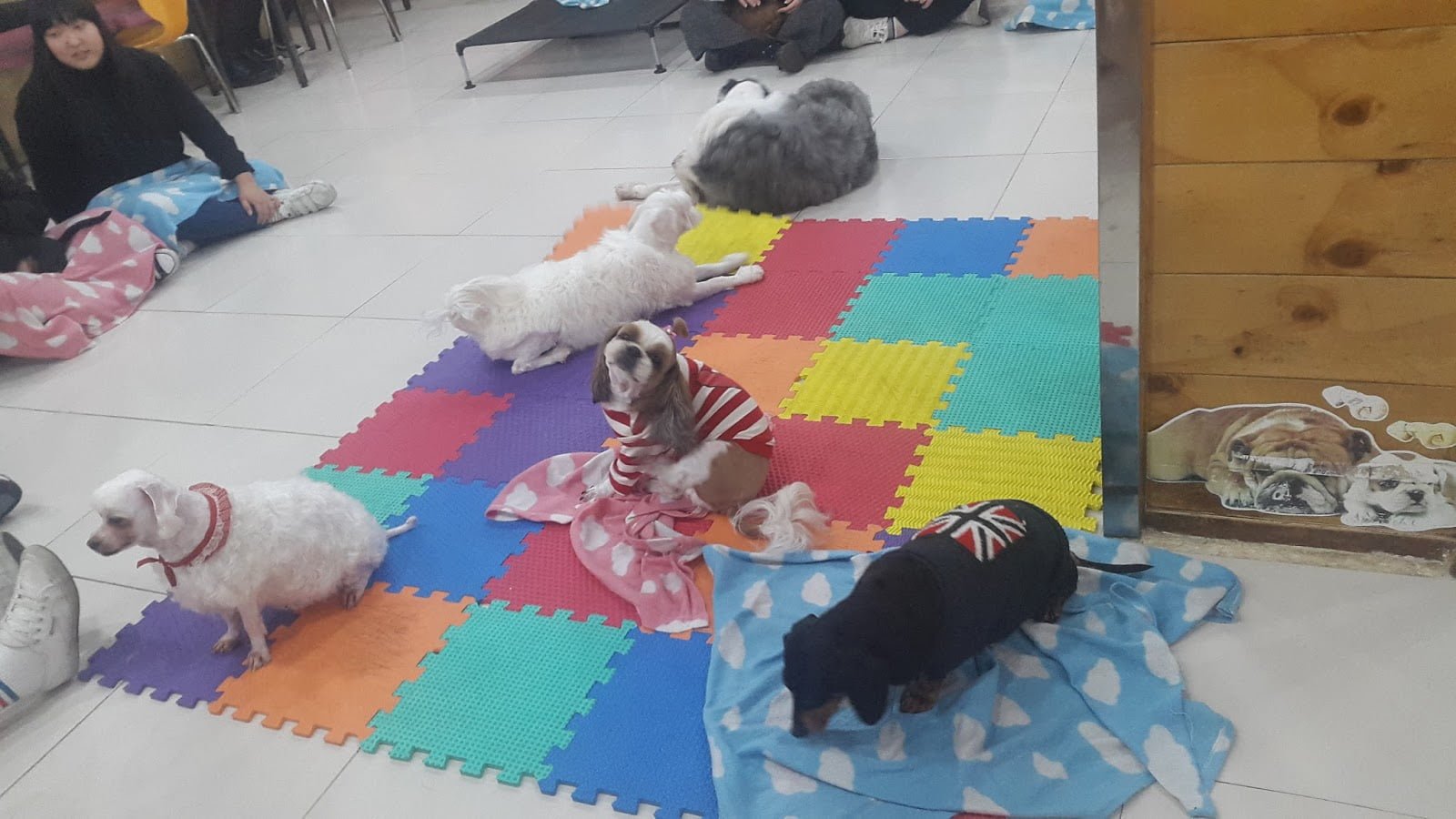 Customers just sit on the floor and wait for dogs to sit on their lap.