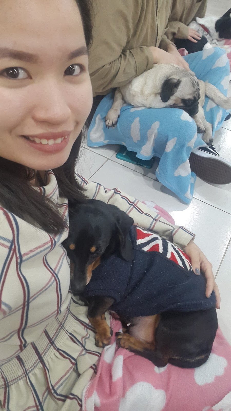 They provide pink and blue blankets that can be used during the interaction with the dogs.