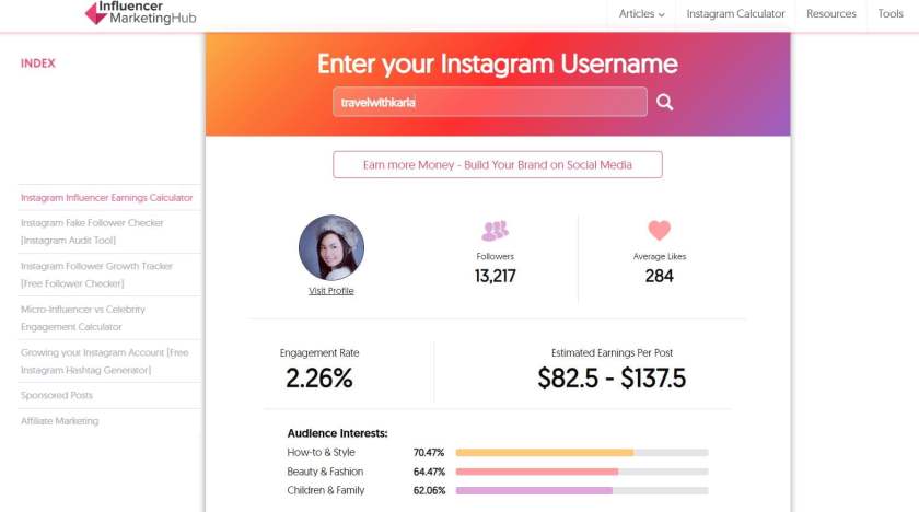 Influencer Marketing Hub provides the estimated earnings per post. The pricing may look enticing but we all know that it still depends on a budget of the brand on how much they’ll pay you for each post. In addition, Influencer Marketing Hub also gives information about your audience’s interests. They also have a fake follower and audience credibility checkers.