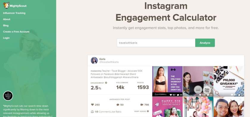 Besides the engagement rate, Mighty Scout provides information about the influencer’s top mentions and top hashtags. It also gives data about the comment: like the ratio of the posts. Mighty Scout is often used by marketers to track their influencers.