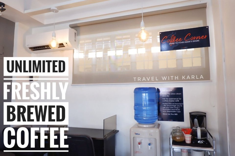 What are the perks? The payment includes free freshly brewed coffee, use of landline telephone, and piso print services.