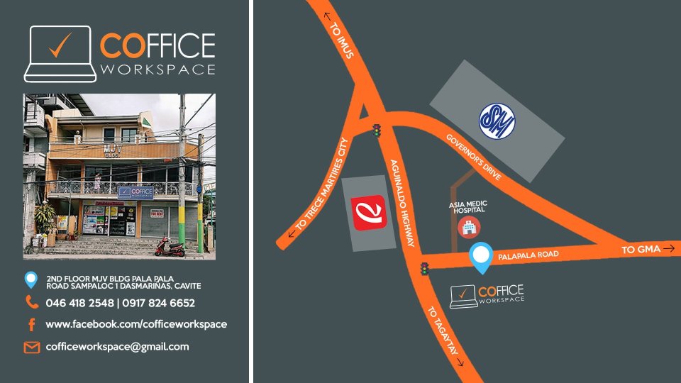 Coffice Workspace is located at 2F MJV Building, Palapala Road, Sampaloc I, Dasmarinas City, Cavite. For inquiries, you may contact them on their social media accounts: